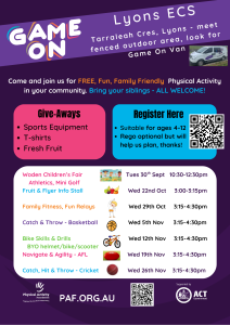 Come and join us for Game On sporty adventures at Lyons Early Childhood School kicking off THIS week – yay, all welcome! Map to show access point and flyer below…